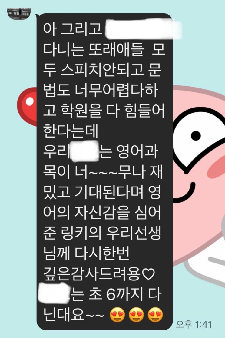 어머님께 문자가 왔습니다. 요즘 주변 이야기를 들어보면, 동네 유명학원을 다니는 또래 아이들조차 영어 스피치는 어려워하고, 문법도 힘들어하며, 학원 가는 것 자체를 부담스러워하는 경우가 많다고 합니다. 물론 영어 공부가 쉬울 수만은 없겠지만, 아이 스스로 영어를 즐기고 기대하는 마음을 갖게 되는 것은 무척 특별하고도 소중한 일이라고 생각합니다. 그래서 더 감사한 마음이 듭니다. 우리 친구는 링키에서 영어를 처음 시작하여 어느덧 초등학교 3학년이 되어 현재는 초등영어 틴즈를 하고있습니다. 그 시간 동안 가장 크게 느끼는 변화는 단순히 영어 실력이 조금씩 쌓였다는 것만이 아닙니다. 무엇보다도 아이가 영어 과목 자체를....... <img src="https://blogthumb.pstatic.net/MjAyNjAzMTRfMTM4/MDAxNzczNDgzMDczNjU4.BNjfVrSH4weQVxgpNhzQUcUfyQnSPlspmX9ODB6kROAg.KcxeKgRmN08ZU6ToSILzakU0l-yfZ6olImarbx3c15wg.JPEG/900%A3%DF1773482622607.jpg?type=s3" />
