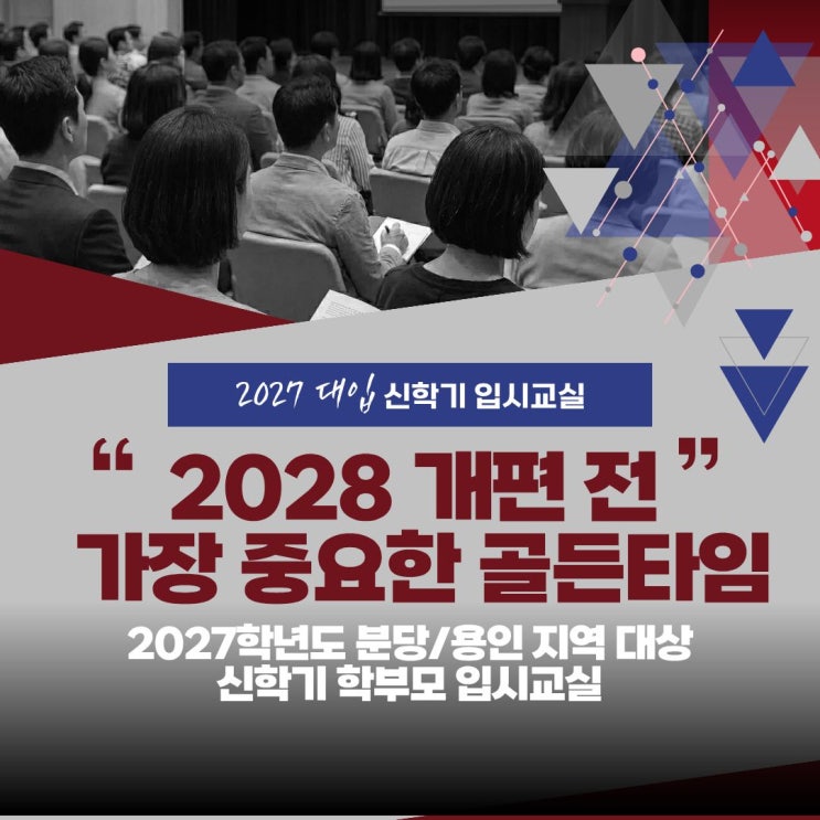 "이제 입시는 정보력 싸움이 아니라 정보를 분석하는 '안목'의 차이에서 결정됩니다." 대입 제도 변화가 예고된 지금!! 2027학년도 입시는 그 어느 때보다 전략적인 준비가 필요한 시기입니다. 특히 2028 대입 개편 이전의 마지막 구조를 활용할 수 있는 중요한 골든타임이기도 합니다. 분당·용인 지역의 실제 입시 결과 데이터를 기반으로 막연한 정보가 아닌 입시에 강한 분당대찬학원이 현실적인 입시 전략을 제시해 드리겠습니다. 2027학년도 분당/용인 지역 대상 ◆신학기 학부모 입시교실◆ "2028 개편 전 가장 중요한 골든타임“ 이번 입시교실에서는 수시·학생부·정시까지 이어지는 입시 흐름을 한 번에 정리해....... <img src="https://blogthumb.pstatic.net/MjAyNjAzMTJfMTU4/MDAxNzczMzIxMTcyMTY3.cpqoWrxKOdNOt-QyfdmYPk4Nqm52ZLUwfbMIyrmX6IQg.aaVe_ipqpipWxS1ntSTdg3pghQoXCPPA-kj8T2rOaZEg.JPEG/%B4%EB%C2%F9_%282%29.jpg?type=s3" />