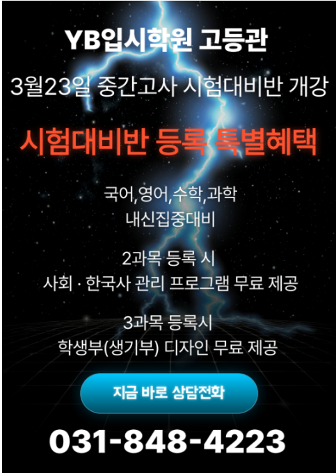 고등부 중간고사 시험대비반 개강 안내 안녕하세요. 고등부 중간고사 시험대비반이 3월 23일 개강합니다. 이번 시험대비 기간에는 국어 · 영어 · 수학 · 과학 내신 집중 대비로 학교별 시험 범위에 맞춘 개념 정리 + 문제풀이 + 시험 대비 관리가 진행됩니다. 시험대비 등록 특전 안내 ✔ 2과목 등록 시 → 사회 · 한국사 관리 프로그램 무료 제공 ✔ 3과목 등록 시 → 학생부(생기부) 디자인 및 관리 무료 제공 시험기간은 짧지만 준비에 따라 결과는 크게 달라집니다. 이번 중간고사에서 학생들이 좋은 결과를 얻을 수 있도록 체계적으로 관리하겠습니다. 대상 : 고등부 개강 : 3월 23일 상담 및 문의는 언제든지 연락 주세요. ....... <img src="https://blogthumb.pstatic.net/MjAyNjAzMjFfMjYx/MDAxNzc0MDc0MjkyNzgy.yoya-sbQQY4gwKpsel70UBdFqnbZu5njDPPuvKi0vLcg.xMtebxIQsmsi-aBAk2y1DMvIIPgWVfTU4RDcUBGSZR4g.PNG/image.png?type=s3" />