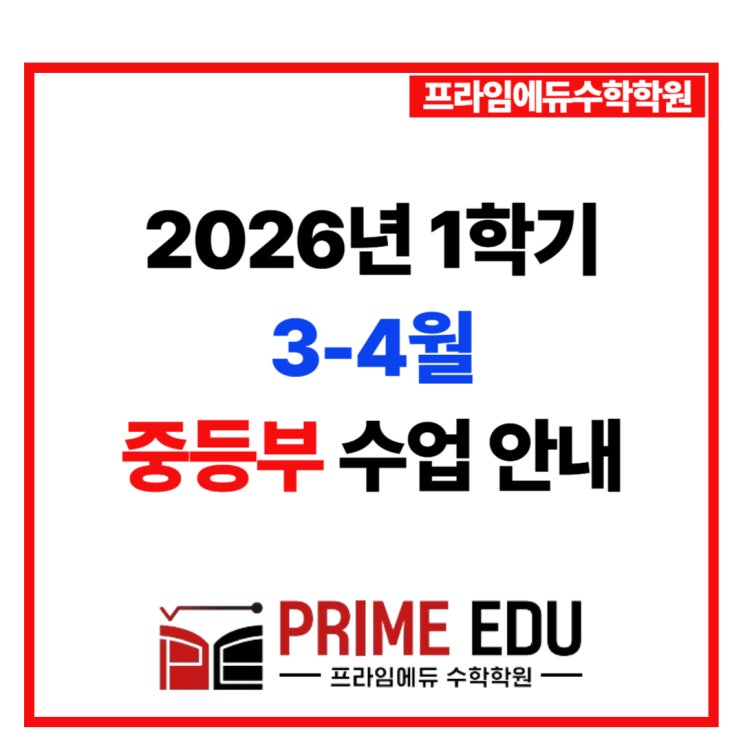 #평촌학원가수학학원 #평촌수학전문학원 #평촌학원가수학내신대비#평촌수학학원#평촌내신대비 안녕하세요 ^^ 프라임에듀수학학원의 2026년 1학기 3 - 4월 중등부 시간표를 안내하도록 하겠습니다. 먼저, 프라임에듀수학학원 정규반 수업은 첫째, 정원 5명 이내의 소수반 수업으로 진행합니다 담임 선생님의 밀착관리로 학생들의 이해도와 학습능력에 따른 탄력적인 수업이 가능합니다 둘째, 엄선된 교재로 수준별 학습을 구현합니다. 검증된 시중교재로 학생의 수준에 맞게 기본교재로 사용하고, 내신대비용 학원 자체 유형별 교재와 기출문제집으로 반복학습을 통해 내신대비에 최적화된 프로그램을 제공합니다. 셋째, 본 수업 후 학생의 집중도....... <img src="https://blogthumb.pstatic.net/MjAyNjAyMjdfMTEz/MDAxNzcyMTk5MTgzOTE3.ZLmJvZechDjGC3iDSEdSVH93tkrABeZQRgXGyNdauAgg.88yMJf3hkrpBm673njstunU8iEoUpjKd3Uri8UyJTHkg.JPEG/%C1%A6%B8%F1%C0%BB_%C0%D4%B7%C2%C7%D8%C1%D6%BC%BC%BF%E4_-001.jpg?type=s3" />