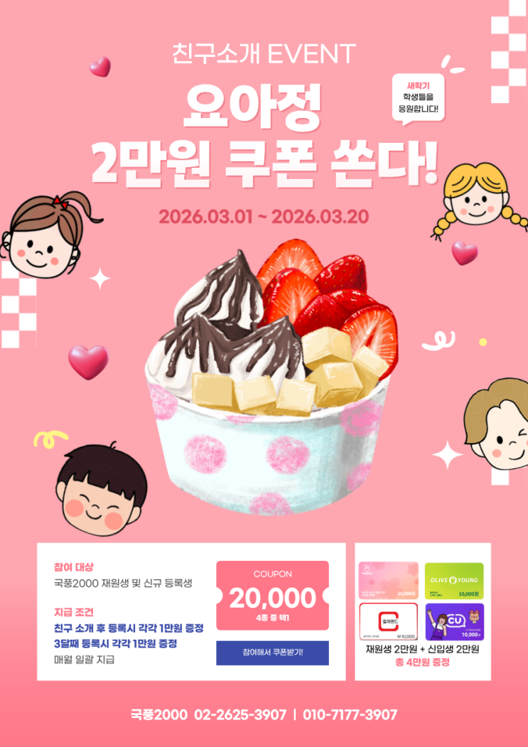 안녕하세요. 국어 성적 향상의 바이블, 초등·중등·고등 국어전문 수능·내신·학종의 삼위일체학습법 광명 철산동에 위치한 국어학원 국풍2000 광명철산직영관입니다. <친구소개 EVENT> 친구와 함께 등록하면 재원생 2만원 + 신입생 2만원, 총 4만원 상당의 혜택을 드립니다! 이벤트 혜택 쿠폰 4종 (택1): 요아정, 올리브영, 컬쳐랜드 문화상품권, 편의점 쿠폰 중 선택 가능 참여 방법 및 지급 조건 참여 대상: 국풍2000 재원생 및 신규 등록생 이벤트 기간: 2026년 3월 1일 ~ 2026년 3월 20일 친구 소개 후 등록 시: 각각 1만원 증정 3달째 등원 유지 시: 각각 1만원 추가 증정 쿠폰은 매월 일괄 지급됩니다. 많은 관심과 참여 부....... <img src="https://blogthumb.pstatic.net/MjAyNjAyMjhfMzcg/MDAxNzcyMjcxMDcxNjMx.3fvMQP2hLoawYuFtpUuaUSwMvkT7pCQ6scId8jZ4nHcg.R5Hj1wgOLmx4d8Nkr0JFfslM9bK0j15CWyRfnqzYi0Ug.PNG/%C3%B6%BB%EA%B0%FC_%C4%A3%B1%B8%BC%D2%B0%B3_%C0%CC%BA%A5%C6%AE.png?type=s3" />