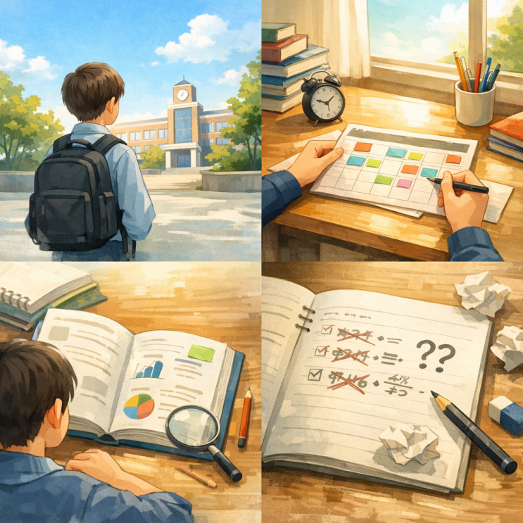 교복이 낯설고, 새 교과서 냄새가 나는 시기입니다. 아이들은 “이번엔 잘해볼게요”라고 말합니다. 부모님은 조용히 기대를 품습니다. 하지만 성적은 다짐보다 습관에서 갈립니다. 개학 직후 4주. 이 시기가 학기 전체의 분위기를 만듭니다. 무리한 계획보다, 기본을 다지는 준비가 필요합니다. 생활 리듬부터 다시 맞추기 방학 동안 늦춰진 생활 패턴. 이 상태로 개학을 맞으면 첫 단추가 흔들립니다. 개학 첫 주는 공부량보다 리듬 회복이 우선입니다. 기상 시간 고정, 취침 시간 일정 유지. 이 두 가지만 지켜도 집중력이 달라집니다. 집중력은 의지가 아니라 습관에서 나옵니다. 교과서 ‘미리 보기’의 힘 많은 아이들이 문제집부터 풉니다....... <img src="https://blogthumb.pstatic.net/MjAyNjAzMDRfMjg1/MDAxNzcyNjI3NDQ2MDgz.aFhAH4w_6f-HUdNsElJoWjmMi7tBRKYjcNM6PSpYrf4g.3tMpH_SmJZzo5tb9RobtTShB68hpUFR3Q38dcMedqN0g.PNG/ChatGPT_Image_2026%B3%E2_3%BF%F9_4%C0%CF_%BF%C0%C8%C4_09_29_20.png?type=s3" />