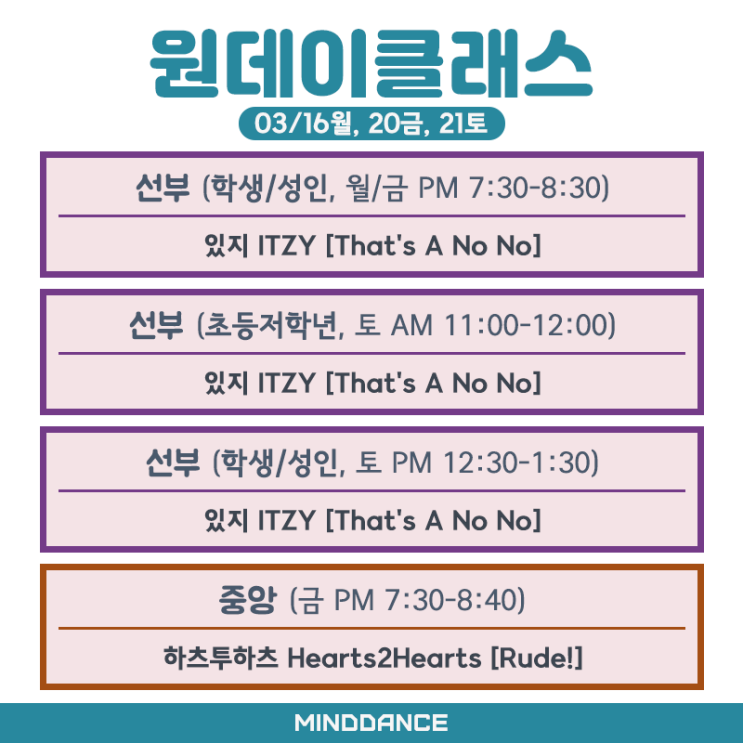 3월 셋째주 [월/금/토요일 댄스 원데이클래스] | 하투하 루드, 있지 댓츠노노 | 안산 중앙동, 선부동 마인드 댄스학원, 안산댄스학원, 시흥댄스학원