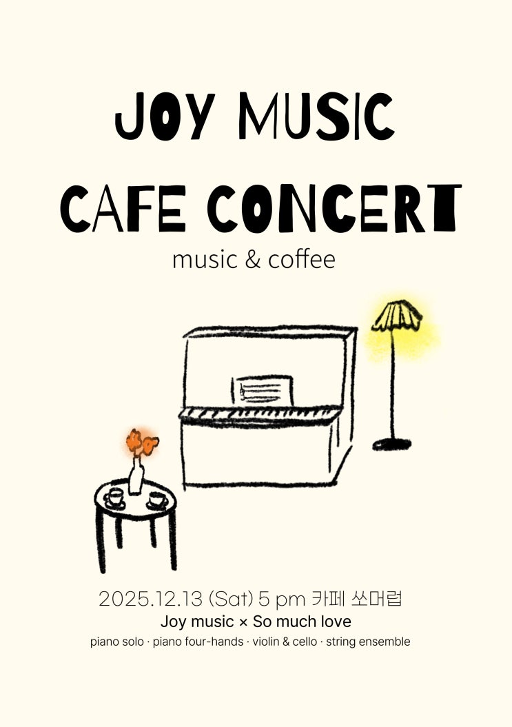 카페콘서트, 따뜻했던 그날 기록 연주회 맛집 조이뮤직 음악학원입니다. 지난 겨울 어느날 쏘머럽에서 카페콘서트를 했어요. 사실 카페 쏘머럽은 전부터 제가 정말 좋아하던 곳이에요. 공간이 편하고 커피도 맛있고, 무엇보다 분위기가 좋아서 카페 연주를 꼭 해보고 싶었답니다. 그 마음이 드디어 현실이 됐던 날이었고요. 연주회 기획 경력 n년차, 조이뮤직의 연주회이니만큼 아주 신경써서 준비했고, 기대만큼 너무 좋았어요. 모두 즐거웠던 기억을 기록으로 남겨봅니다. Joy music x So much love 조이뮤직 x 카페 쏘머럽 연주회 포스터 마음에 드는 시안이 없어서 수작업으로 만들어 본 포스터 (이제는 하다하다 그림도 그립니다?....... <img src="https://blogthumb.pstatic.net/MjAyNjAzMDRfMTQw/MDAxNzcyNjEyNDIyMDIy.bOXI7YErPSTeMGWwY4DAhLpYZ7hj9ulTjE-BEOKgvwsg.gf_mfreNeqNbaXmvbRds5VCNNHluh0ghw4Qwa7FTUqQg.JPEG/pm%BC%D2%B9%AE%C0%DA.jpg?type=s3" />