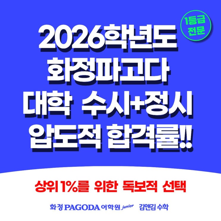 [2026학년도 대입 신화] 화정파고다 영어 & 김앤김 수학, 압도적 합격률로 증명하다! 안녕하세요, 화정 지역 수험생들의 든든한 입시 파트너 화정파고다 영어학원 & 김앤김 수학연구소입니다. 2월 정시 합격자 추가 업데이트 결과, 우리 화정파고다 학생들이 KAIST를 비롯하여 연세대, 고려대, 성균관대 등 주요 상위권 대학에 대거 합격하는 경이로운 쾌거를 이루어냈습니다! 수시부터 정시까지, 2026학년도에 보여드린 이 압도적인 결과는 결코 우연이 아닙니다. ▣ Premium 영어 : 수능 영어의 본질을 꿰뚫는 상위권 전담 커리큘럼 ▣ Premium 수학 : 서울대·연고대 출신 최강 강사진의 상위 1% 맞춤 소수정예 수업 이 두 축을 바탕으....... <img src="https://blogthumb.pstatic.net/MjAyNjAzMDlfMTUz/MDAxNzczMDQxMTM0MzUx.03GiFhozGRlFzN9EvXBXRkmgSQ3az7ZycAA0nmAqEkog.l58XC4GL5ILa-t1RXVb1z67CWemBaIxoFGcfoJFFgjUg.JPEG/%BC%F6%BD%C3%C1%A4%BD%C3%C7%A5%C1%F61.jpg?type=s3" />