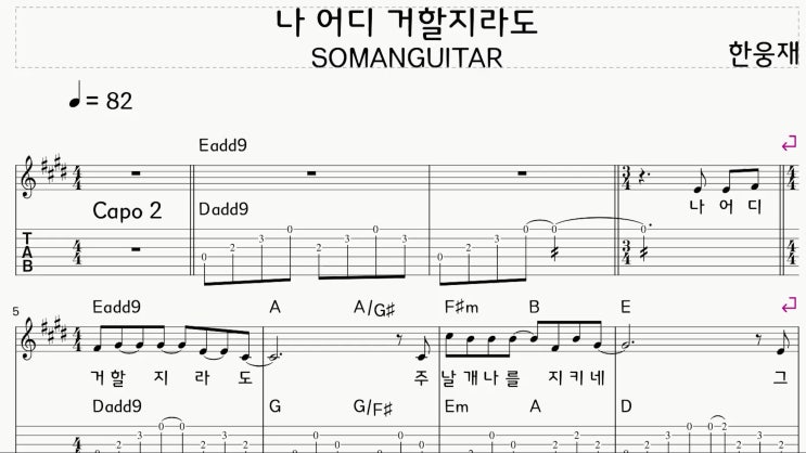 [E Key] 한웅재 - 나 어디 거할지라도 악보 행신동 실용음악학원 소만마을 기타교습소