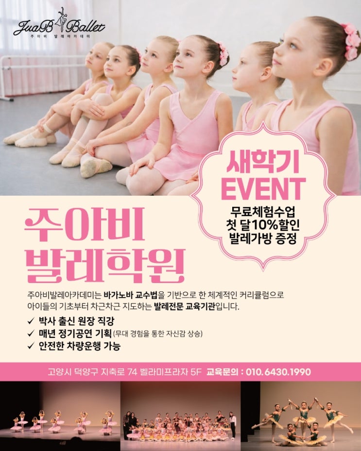 ✨ 주아비발레 새학기 이벤트 ✨ 체계적인 레벨별 맞춤 수업으로 기초부터 전공 준비까지 탄탄하게 지도합니다 새학기 특별 혜택 ✔ 무료 체험 수업 ✔ 첫 달 수강료 10% 할인 ✔ 발레 가방 증정 차량 운행 가능 안전하고 편리한 등·하원 서비스로 학부모님의 걱정을 덜어드립니다. 새학기, 제대로 배우는 발레의 시작 주아비발레에서 만나보세요 ⚘️교육문의 ☎️ 010.6430.1990 방문상담 시 사전에 예약부탁드려요 #주아비발레 #새학기이벤트 #발레전문학원 #박사원장직강 #레벨별수업 <img src="https://blogthumb.pstatic.net/MjAyNjAzMTFfMjQw/MDAxNzczMjE1OTIxNjEw.LVVcGoqu8uddaj1JuV0ekuTghbFLl0MLpSoNjLLn4p8g.9B2Nc173Q4n95h8vi1mmG-1xYUudPIzpxdDI1sScBSEg.JPEG/900%A3%DF1771494461082.jpg?type=s3" />