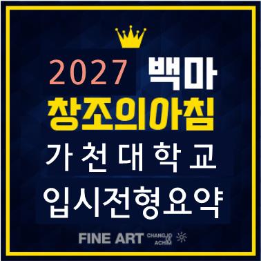 일산 미대입시 전문학원 백마창조의아침에서 전해드리는 2027학년도 입시전형 소개! 안녕하세요! 일산역미술학원 백마창조의아침입니다. 오늘 일산역미술학원과 함께 만나볼 미대입시는 2027 가천대학교 실기우수자전형 미술디자인학부 소식입니다. 2027 가천대학교 미술디자인학부 실기우수자전형 [수시 모집인원] 회화전공 30명 / 자유표현 조소전공 25명 / 기초조형 시각디자인전공 30명 / 기초디자인 산업디자인전공 30명 / 기초디자인 [수시 지원자격] 고등학교 졸업(예정)자 및 법령에 따라 이와 같은 수준 이상의 학력이 있다고 인정된 사람 [수시 전형 방법] 실기 70% 학생부 30% 수능 최저학력기준 : 없음 [정시] 수시 모집 등록 결과에....... <img src="https://blogthumb.pstatic.net/MjAyNjAzMDJfMjgx/MDAxNzcyNDQ1MTMzODgy.5jsH-sd4IRZ9GZCEyY8t_E2AVYuFlpyyynutMDyZqWwg.xFVmrHSqLiOebwT2chzix1wEt0l6cAcsRi6LSb7kbmEg.JPEG/2027_%B0%A1%C3%B5%B4%EB%C7%D0%B1%B3_%B9%CC%BC%FA%B5%F0%C0%DA%C0%CE%C7%D0%BA%CE_%BD%C7%B1%E2%BF%EC%BC%F6%C0%DA%C0%FC%C7%FC.jpg?type=s3" />