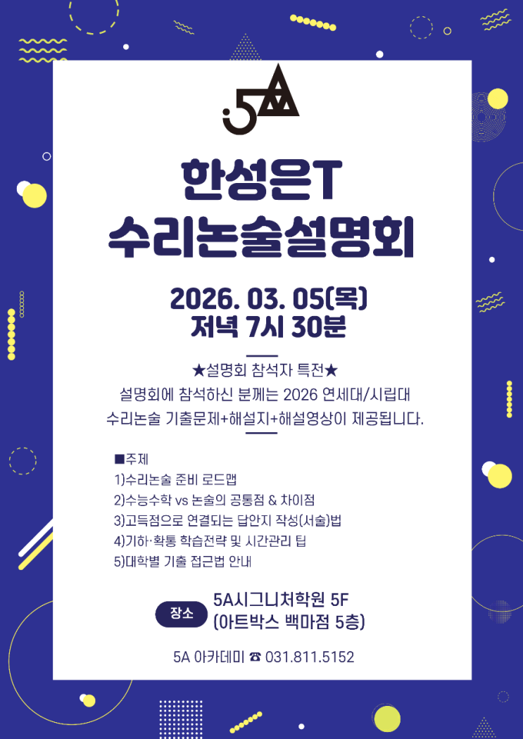 [5A아카데미] 한성은T 2026 수리논술 설명회 안내 (*예약은 하단 예약링크 클릭) -------------------------- ■ 일 시 3.05(목) 저녁 7시 30분 ▶▷ [예약링크] http://tiny.cc/oqoz001 -------------------------- ★설명회 참석자 특전★ 설명회에 참석하신 분께는 2026 연세대/시립대 수리논술 기출문제+해설지+해설영상이 제공됩니다. 2026 수리논술전형 대비를 위해 "지금 무엇을, 어떻게 준비해야 하는가”를 가장 정확하게 알려드리는 자리입니다. 수리논술 전문 한성은 선생님이 최근 출제 경향과 대학별 대비전략을 정리해 드리며, 올해 고려대 수리논술 합격생의 실제 공부 루틴·답안 작성법까지 공개됩니다. 막막했던 논술 준비....... <img src="https://blogthumb.pstatic.net/MjAyNjAzMDJfNzAg/MDAxNzcyNDU4OTk2MTg0.dnRJNLjzSARXWcQ3ASvd-0fsaoBt96hxxk7qNAmapbkg.VInDv5qskRNXLE0NYtFEsjAdSUTHFJgqD4AKiqeKj3Eg.PNG/900%A3%DF1772457977093.png?type=s3" />