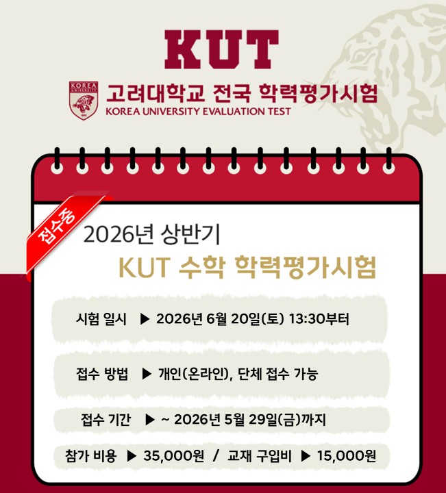 수학 평가시험 KUT수학 2026년 상반기 시행요강 주최기관 고려대학교 전국 수학 학력평가시험 진행본부 평가일시 2026년 06월 20일(토), 오후 1시 30분 ~ 2시 50분(총 80분) 평가대상 초등 1~6학년, 중등 1~2학년 출제문항 각 학년별 30문항 평가범위 결과발표 2026년 07월 14일(화) 오전 10시 발표 ※홈페이지에서 발표 시상일시 2026년 상반기 평가시험은 온라인 시험으로 인해 별도의 시상식은 진행되지 않음(상장, 메달 개별발송) <img src="https://blogthumb.pstatic.net/MjAyNjAzMDZfOTAg/MDAxNzcyNzc2MjYwMDM3.rala6SzDFMIpuTBIS5NmsOmyZNygWVAwXt8_uJRYEbUg.jmJTHwdyO_2anH4ZGlraMgw5GI6yZvBSbiLHotTqZ2Yg.JPEG/%BB%F3%B9%DD%B1%E2%B0%ED%B4%EB%B0%E6%BD%C3%BE%C8%B3%BB%C0%E5.jpg?type=s3" />