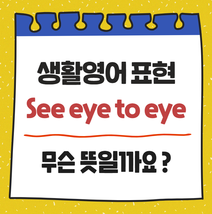 “See eye to eye”—두 사람이 완전히 의견이 맞다, 같은 생각이다라는 뜻입니다. 반대로 not see eye to eye라고 하면 의견이 안 맞다는 의미죠. 협상·팀 프로젝트·가족 대화까지 폭넓게 쓰이는 일상표현이에요. 오늘 포스트에서는 “See eye to eye”의 뉘앙스를 간단히 살펴보고, 다양한 상황에 바로 써먹을 수 있는 예문 10개를 함께 확인해 봐요! 1. We finally see eye to eye on the budget. 우리는 마침내 예산에 대해 의견이 일치했다. 2. They don’t see eye to eye on parenting styles. 그들은 양육 방식에 대해 의견이 맞지 않는다. 3. I’m glad our teams see eye to eye on the timeline. 우리 팀들이 일정에 대해 같은 생각이....... <img src="https://blogthumb.pstatic.net/MjAyNTA4MDlfMjUw/MDAxNzU0NzE0Mjg1NTE2.xj_jdAXfzh8BsTtRExoGGlWne5OKbKmRMf0jZvtqOMwg.2i1JsXGPvIy9rpMPapcsxc3HOH4ZuMo4-cnkFZGGiHEg.PNG/image.png?type=s3" />