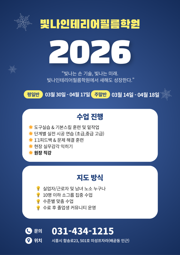 인테리어 시장이 꾸준히 성장하면서 필름 시공 기술자의 수요도 빠르게 늘고 있어요. 특히 짧은 기간 안에 기술을 익혀 바로 현장에 투입될 수 있다는 점에서 많은 분들이 관심을 갖고 있는 분야죠. 빛나인테리어필름학원은 이러한 흐름에 맞춰, 실무 중심의 교육으로 ‘바로 일할 수 있는 기술자’를 양성하는 데 집중하고 있습니다. 왜 ‘빛나인테리어필름학원’인가? 실전 중심 커리큘럼 — 실제 현장에서 사용하는 자재, 도구, 시공 방식 그대로 배우는 과정 1:1 밀착 지도 — 초보자도 빠르게 성장할 수 있도록 개인별 피드백 제공 다양한 시공 실습 — 가구, 문, 몰딩, 싱크대, 현관 등 필름 시공 전 영역 실습 취업·창업 지원 — 현....... <img src="https://blogthumb.pstatic.net/MjAyNjAzMDVfMTQ4/MDAxNzcyNjg4OTI0NTAz.Wk7pVJwcdWAKK1PVHG2eO2eBBlKb-rii6CwX0V-X0dYg.mKTMKfcYE6h9DN12HlqoWs7PQ1JD0JcGRCjpb7Q5zTQg.PNG/%C6%AF%B0%AD.png?type=s3" />