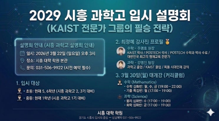 시흥 과학고 입시 설명회 KAIST 전문가 그룹의 합격 전략 공개 최근 몇 년 사이 과학고 입시 경쟁은 완전히 달라졌습니다. 예전처럼 단순히 내신과 선행만으로 합격하는 시대는 이미 끝났습니다. 지금의 과학고 입시는 사고력 문제 해결 능력 과학적 탐구 경험 이 세 가지를 어떻게 전략적으로 준비했는지를 평가합니다. 많은 학부모님들이 이런 질문을 하십니다. “지금 초등 5학년인데 과학고 준비 늦은 건가요?” “중1인데 이미 준비한 아이들이 많다던데 어떻게 시작해야 할까요?” 이 질문에 대한 현실적인 답을 드리기 위해 설명회를 준비했습니다. 시흥 과학고 입시 설명회 안내 이번 설명회에서는 단순한 정보 전달이 아니라 실제 합격....... <img src="https://blogthumb.pstatic.net/MjAyNjAzMDZfMTE4/MDAxNzcyNzkxMzQ0NTQy.Y3yKHPUEdBBIT_X4CrdOa5N2oPVZY-q75NYKsI02tsQg.NGgQ9EDQ2Nta_NRAAnYar8R38Hy2qLNatvYIOsOpRuMg.JPEG/KakaoTalk_20260305_192403439.jpg?type=s3" />
