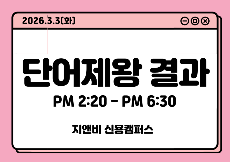 안녕하세요, 지앤비 신용캠입니다. 이번 달 3일, 우리 친구들의 학교 입학 & 개학과 함께 단어제왕이 있었는데요! 반 별로 현재 단어 시험을 보고 있는 단어장 기준으로 단어제왕 시험지가 만들어졌고, 비슷한 레벨의 친구들이 같은 시험지로 응시하게 되었어요. 그 결과를 바로 발표하겠습니다. 우리 모든 지앤비 친구들 수고했습니다.^^ 우리 친구들 단어제왕을 위해 평소에 열심히 공부하고 노력해주었는데요~! 입상 한 친구들 리엔 원장님이 상품 쏩니다. 수고 많이 하셨습니다. 다음 단어제왕도 기대해 주세요! 학 습 상 담 010 4592 7800 #GNB #GNB영어학원 #신용동영어 #신용동어학원 #신용동초등영어 #신용동유치원영어 #신용동중등....... <img src="https://blogthumb.pstatic.net/MjAyNjAzMTlfMTE2/MDAxNzczODk1NjI1MDU1.8VtFfdqsUAEF6mFJx56x9MS5U1jjvMhwpFwmyj40Kncg.LBiNt0FvtoVXYv6x1Dp428LOBxTHpJGEnr_uVa_bxwkg.PNG/1.png?type=s3" />