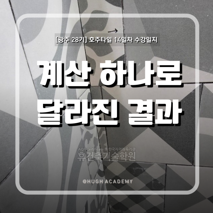 안녕하세요 휴건축기술학원입니다. 광주에서 진행 중인 호주타일 국비지원 과정 28기 수강생들의 14일차 실습 현장을 기록합니다. 이번 실습에서는 벽타일 시공을 이어가며 브릭패턴 적용, 다이아 패턴 작업, 코너 마감과 함빠 재단까지 함께 진행되었습니다. 반복적인 시공 과정 속에서 단순히 타일을 붙이는 작업을 넘어, 기준을 유지하고 흐름을 맞추는 과정의 중요성을 체감하는 시간이었습니다. 특히 호주타일 시공에서 요구되는 정밀도와 작업 순서에 대한 이해를 실제 실습을 통해 확인할 수 있었습니다. ※ 이 글은 28기 수강생들의 실제 수강일지를 바탕으로 정리된 실습 기록입니다. 13일차 : 28기 수강일지 다이아 패턴과 전기구멍 재....... <img src="https://blogthumb.pstatic.net/MjAyNjAzMjRfODUg/MDAxNzc0MzMxNDMwMzUx.YoOwdpNia9f5875oqx1GBNF3FKAD40IXVODRPYt5tD8g.zIxHgPE_LPFY88ib1_aayJyfSen7G4whicdQRTD2jfog.PNG/%BC%F6%B0%AD%BB%FD%C0%CF%C1%F6.png?type=s3" />