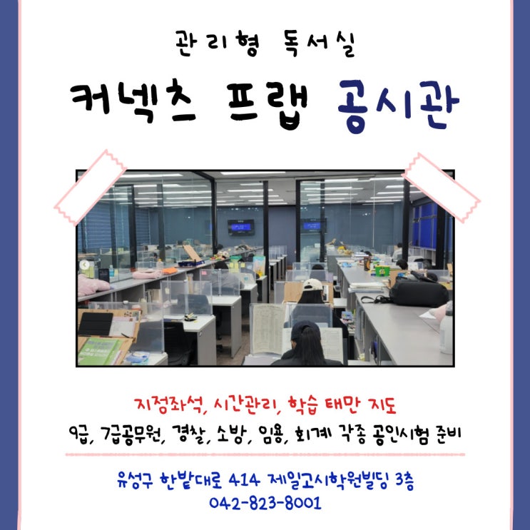 안녕하세요~ 커넥츠프랩 궁동점입니다 !! 올케어 관리형 독학관인 커넥츠프랩은 각종 자격증, 채용시험을 준비하면서 시간을 철저히 관리해주고 혼자 집에서, 카페에서 공부하기 어려우신분들이 좋은 환경속에서 시간을 확보해가며 공부를 하기 위해 찾아주십니다. 관리형 학습관안에서의 성인들만 있으며 각종 시험을 준비하시는분들이 정말 열심히 공부하고 계시기에 분위기가 정말 공부할수밖에 없는 분위기랄까요,,? 당연히 냉난방 완비에 무선 와이파이 사용이 가능하면서 지정좌석, 남녀구분석으로 이루어져 있어 쾌적한 학습이 가능합니다. 공부하는 습관이 잡하지 않는 수험생 어떻게 공부를 해야하는지 방법을 모르는 수험생 엄격한 관....... <img src="https://blogthumb.pstatic.net/MjAyNjAzMDZfNjEg/MDAxNzcyNzYxNDQ1MDM2.pCWNOPjXGmqhpUTfPRg-N_bJplVFS8DJt-aqdbdaKjQg.3w4RTv9ISw0UTArib1zUTR3PdKcWWP2q-grdpGLP_Nog.JPEG/%C1%A6%B8%F1%C0%BB-%C0%D4%B7%C2%C7%D8%C1%D6%BC%BC%BF%E4_-001_%286%29.jpg?type=s3" />