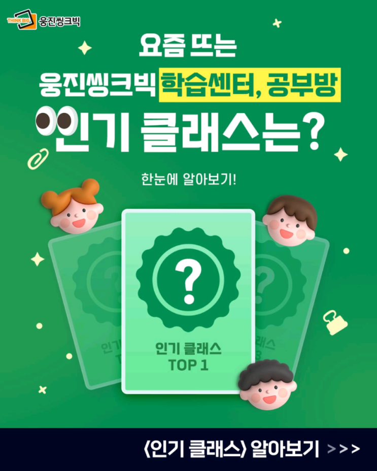 요즘 웅진씽크빅 학습센터·공부방에서 문의 가장 많은 인기 클래스는 무엇일까요? 한눈에 정리해드립니다! 인기 TOP 1 | AI수학 프로그램 개념 → 연산 → 서술형까지 단계별 학습 AI가 아이의 학습 데이터를 분석해 수준에 맞는 문제와 학습 경로를 추천하는 맞춤형 수학 학습 프로그램 인기 TOP 2 | B.I.G 프로그램 읽기 · 쓰기 · 말하기를 균형 있게 배우며 영어로 생각하고 표현하는 힘을 키우는 체계적인 영어 문해력 프로그램 시원스쿨로 영문법·단어까지 탄탄하게! 인기 TOP 3 | 척척창의코딩 게임과 미션 형식으로 배우는 재미있는 코딩 학습 논리력과 문제 해결력을 키워요. 결국 중요한 건 ✔ 우리 아이 현재 수준....... <img src="https://blogthumb.pstatic.net/MjAyNjAzMTdfNzUg/MDAxNzczNzMwNTQyNTc3.R5fZKJrO5E_9PlxzG1zr2Dap5AFYfCFCNA3K1ITPeYsg.ToiQ_-emFlchncR6TboUHzgOFROJMyDPuj5HW_qGwAEg.PNG/900%A3%DFDV7oBOKgXh5%A3%DF4.png?type=s3" />