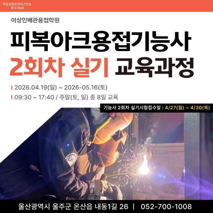 안녕하세요. 울산국비용접학원 이상인배관용접학원입니다. 이번주 20일(금)까지 기능사 필기시험접수일입니다. 다들 접수하셨을까요~? 아래의 일정을 확인하시고 꼭 접수해주세요! 기능사 2회차 시험일정 울산에서 국비지원으로 용접자격증 취득을 준비하시는 분들을 위해 피복아크용접기능사 실기 2회차 교육 과정을 안내드립니다. 울산 용접학원을 찾고 계시거나 국비지원 용접교육, 주말반 용접기능사 과정을 알아보시는 분들께 도움이 되는 정보입니다! 이번 교육은 피복아크용접기능사 실기 대비 과정으로 초보자도 참여 가능한 국비지원 용접교육입니다. ✔ 피복아크용접 실기 집중 교육 ✔ 자격증 취득 대비 커리큘럼 ✔ 실습 위....... <img src="https://blogthumb.pstatic.net/MjAyNjAzMThfMjE4/MDAxNzczNzk4MDc2NTI4.l39Gd_PN2xzwB0JMUsLuPhYlwRYTYrJT6ZbxOogRsDcg.9mdEHkmtTwO_LFwNd6G8Le7Uw0o9R36CMzfnSd7GKvUg.PNG/1.png?type=s3" />