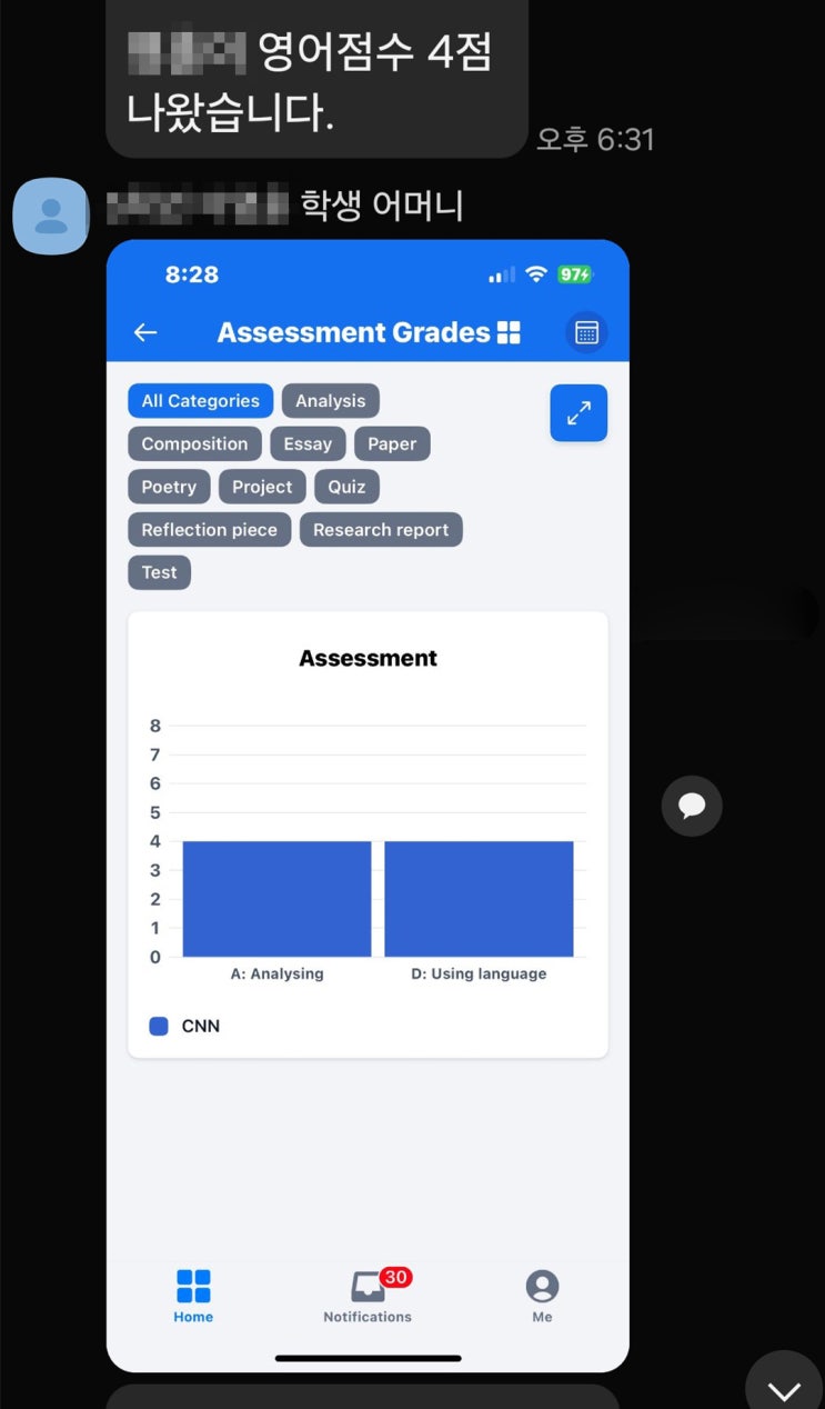 안녕하세요. 어라운즈 아카데미 제이슨입니다. 몇일 전 저희 학원에서 수업을 듣는 채드윅 재학생이 영어 두가지 영역에서 7점을 받았다는 기쁜 소식을 전달 받았습니다. 오늘은 모두들 궁금해하시는 채드윅을 비롯한 국제학교 내신 관리에 대해서 함께 이야기 드려보고자 합니다. 채드윅 GPA 관리가 중요한 이유 Chadwick International은 국내 국제학교 중에서도 학업 강도가 높은 학교입니다. IB 기반 커리큘럼으로 운영되며, 단순 암기가 아닌 사고력 중심으로 평가가 이루어집니다. 영어 과목은 다음 네 가지가 GPA를 좌우합니다. ✔ Analysing – 텍스트를 깊이 있게 분석하는 능력 ✔ Using Language – 정확하고 세련된 표현력 ✔ Organi....... <img src="https://blogthumb.pstatic.net/MjAyNjAzMDRfMjI2/MDAxNzcyNTk3ODg1NzE2.bWBTAHn0DyUJbU1Cn9CEnd72OKhGftrLnhEPxYn3vjIg.NAeqRq0ZO_ShxqkAyGWQVA5RuXtr1m-aKhSxacZJBI0g.JPEG/%C3%A4%B5%E5%C0%A8_4%C1%A1.jpg?type=s3" />