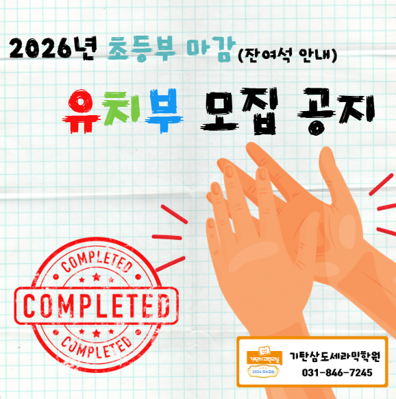 안녕하세요? 아이들의 탄탄한 기초 학력과 바른 공부 습관으루 세워가는 기탄신곡삼도세라믹학원입니다. 새 학기 준비로 분주한 일정 속에서도 저희 학원에 보내주시는 깊은 신뢰와 관심에 진심으로 고개 숙여 감사 드립니다. 아이들의 소중한 '첫 공부'를 지도하고 있다는 사명감을 가지고 모든 교사진들이 매 수업 정성을 다해 지도하겠습니다. 많은 분께서 찾아주신 덕분에 현재 초등부 수업은 전 타임 마감이 되었습니다. 높은 재원율료 인해 신규 입원이 쉽지 않은 상황임에도 기다려 주시는 분들께 다시 한 번 감사의 말씀을 전합니다. 기탄신곡삼도세라믹학원의 초등부 1,2학년 대상에 한해 1타임 (2:10-3:00) 소수의 인원만 추....... <img src="https://blogthumb.pstatic.net/MjAyNjAzMTFfMjc1/MDAxNzczMTU1NDk4MDcx.E0GcKfH5oTmba-zWekkwNxJZaH64-qVhV5GEugZyVjcg.KjfUJSH1PXr3Fsr8I1vOLqgMSa6gXqNl0hh7vjpvReAg.PNG/image.png?type=s3" />