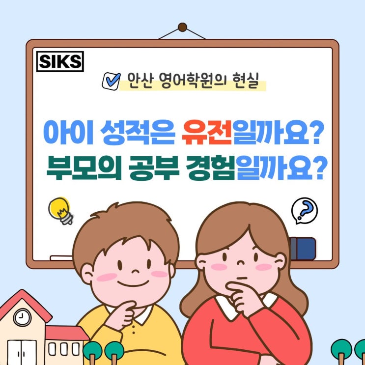 안녕하세요. 영어 시작과 끝 식스에듀 안산 고잔동 영어 전문학원 SIK's EDU 입니다. 안산 영어학원의 현실 조금 불편한 이야기일 수도 있습니다. 하지만 교육 현장에서 학생들을 가르치다 보면 자주 떠오르는 질문이 있습니다. 아이 성적은 정말 유전일까요? 아니면 부모의 공부 경험과 관련이 있을까요? 많은 부모님들이 이렇게 말씀하십니다. “우리 아이는 머리가 안 좋은 것 같아요.” “공부가 체질이 아닌 것 같아요.” 하지만 수많은 학생들을 가르치다 보면 조금 다른 결론에 도달하게 됩니다. 아이의 성적은 머리의 문제가 아니라 준비의 문제 인 경우가 많기 때문입니다. 생각해 보십시오. 아기가 태어나자마자 바로 뛰어다닐 수....... <img src="https://blogthumb.pstatic.net/MjAyNjAzMTNfMjA4/MDAxNzczMzk2Njc3MDQz.-5fxcUY8Ka61wX8JF-R2VFjD7sCbig0slgmFuG_I2tgg.aOEIcjRlKktnZyHXgaBgplVXo-WhBkohLr23nq-CVF4g.JPEG/1.jpg?type=s3" />