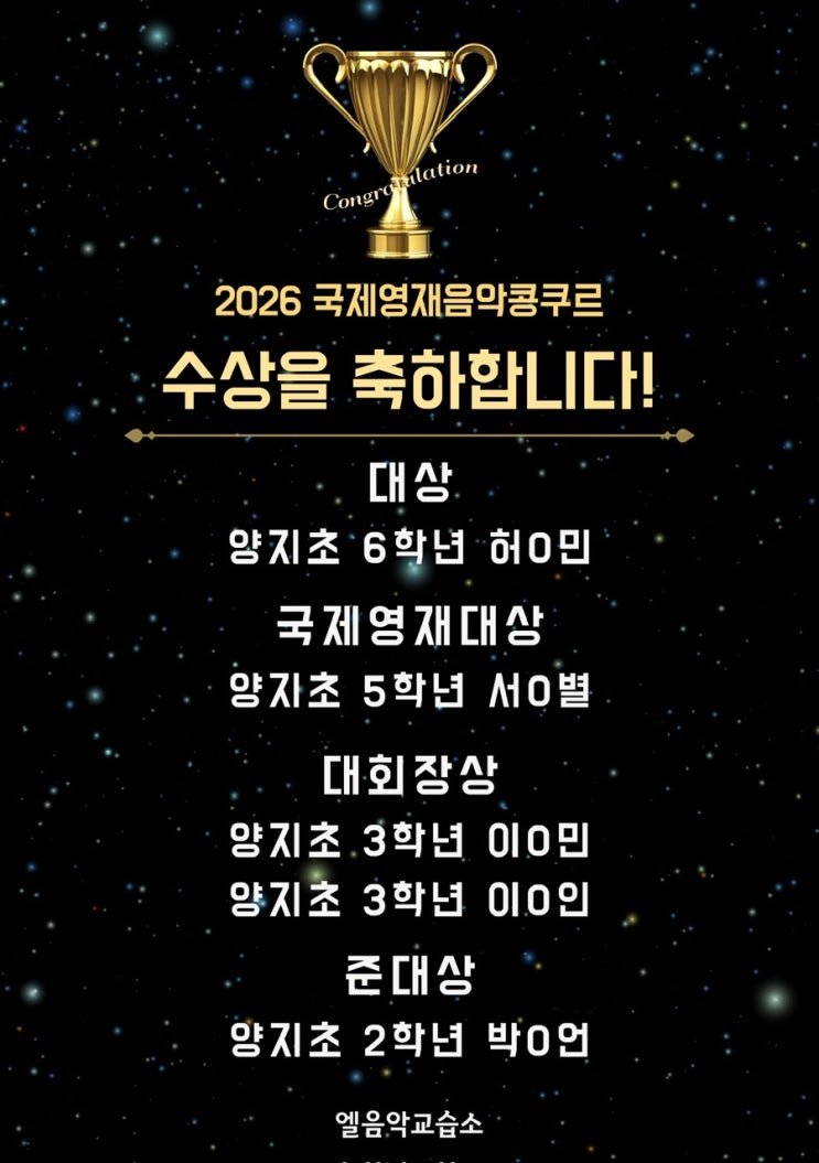 [안산양지초피아노] 2026 안산 국제영재콩쿠르 전원 수상을 축하합니다!