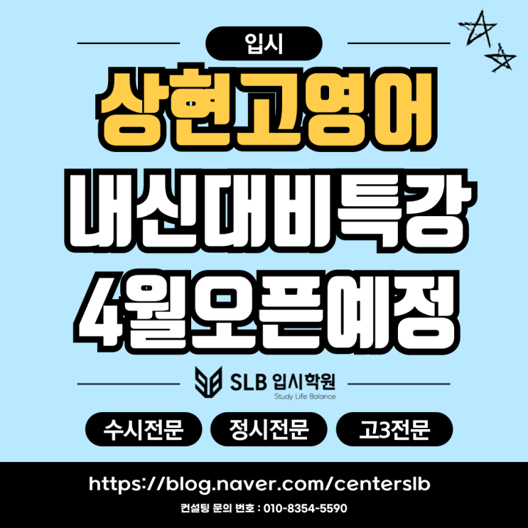 SLB입시학원 영어 내신대비 특강 4월 오픈 예정 올해 영어 교과서 수준이 올라가면서 학교 시험 난이도도 함께 상승하고 있습니다. 특히 최근 시험에서는 기본 어휘력 부족이 문제로 나타나는 경우가 많습니다. 그래서 SLB입시학원에서는 영어 단어 시험 대비를 더욱 강화하여 운영하고 있습니다. 하지만 단어만의 문제가 아닙니다. 최근 영어 지문 자체의 수준이 한 단계 올라간 상태입니다. 두번째 핵심은 문법입니다 확실한 독해를 위해서는 문법 특강 참여가 필수입니다. 사실 작년까지만 해도 SLB입시학원에서는 영어 1등급을 목표로 하는 학생이 아니라면 굳이 문법을 강하게 요구하지 않았습니다. 왜냐하면 문법을 몰라도 3등급 정도까지....... <img src="https://blogthumb.pstatic.net/MjAyNjAzMTdfMjA2/MDAxNzczNzU4MTY1ODUw.y8zTsKJ7fk3OYedVsxHgSajMNpgLHV79A0qd2h9OnPYg.eFXnKFtxT_j2qTWkfkfjMmlZ3d44aP4vYS3LRmLlGlAg.PNG/%C1%A6%B8%F1%C0%BB-%C0%D4%B7%C2%C7%D8%C1%D6%BC%BC%BF%E4_-001.png?type=s3" />