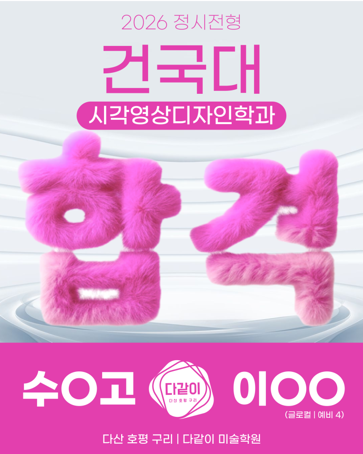 2026 건국대학교 정시 합격 소식! 다같이 미술학원의 정시 합격 소식을 전해드립니다! 시각영상디자인학과 이OO 수O고 (예비4) (작년 합격자를 기준하여 예비합격자를 공개합니다) 상상을 현실의 이미지로 구현해낼 시각영상디자인과 합격을 정말 축하합니다! 기본기부터 실전 감각까지 놓치지 않는 다같이만의 입시 전략이 여러분의 꿈을 향한 든든한 징검다리가 되기를 소망합니다. 이OO 학생의 크리에이티브를 마음껏 펼치기를 응원할게요! <img src="https://blogthumb.pstatic.net/MjAyNjAzMDdfMjc3/MDAxNzcyODY4NjE5NDk2.pwVp5mQ0ZRHt70SaLqEBr0hlfwVia9qVJdZTIlYMUVIg.TPjI5mMye5ioQZYxx3tqJjCu36MRK3OCYTOfAwsiAkYg.PNG/%B0%C7%B1%B9%B4%EB_2_%281%29.png?type=s3" />