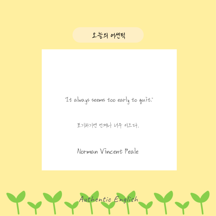 “It always seems too early to quit.” 포기하기엔 언제나 너무 이르다. Norman Vincent Peale <img src="https://blogthumb.pstatic.net/MjAyNjAxMjhfMTgz/MDAxNzY5NTk1NzU1Njk1.MwgwodUYJd7R21ud-MDFrKKFD7MkN4WxIa_tFc-j98Mg.-3XP-1iVpp0kP1-vIsJ6neuvetWffRor73fEkFs9HiMg.PNG/029.png?type=s3" />