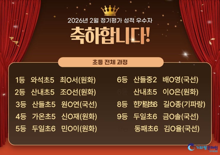 [기파랑문해원 파주운정원] 2026년 2월 정기평가 성적 우수자
