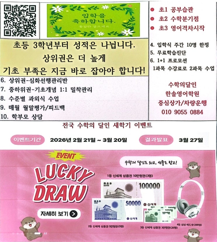 안녕하세요 옥정동 수학의달인 한솔영어학원입니다 새학기가 시작되면서 많은 학부모님들이 이런 고민을 하십니다. ✔ 초등 영어 공부 어떻게 시작해야 할까요? ✔ 초등 수학은 선행을 해야 할까요? ✔ 우리 아이 성취도를 올리려면 어떻게 공부해야 할까요? 초등학교 시기는 공부 습관과 기초 실력이 만들어지는 매우 중요한 시기입니다. 이 시기에 영어와 수학 기초가 제대로 잡히면 중학교 내신까지 훨씬 수월해집니다. 오늘은 초등 영어수학 성취도를 높이는 공부 방법을 알려드리겠습니다. 1️⃣ 초등 영어 공부는 파닉스와 읽기가 중요합니다 초등 영어에서 가장 중요한 것은 읽기 능력입니다. 읽기가 되지 않으면 -단어 외우기도 어렵....... <img src="https://blogthumb.pstatic.net/MjAyNjAzMDhfMTE5/MDAxNzcyOTgwMDAwNjE0.apJ20ZWTV1Rxi4l1DtVM3MPCJ9Wnn2E-mXxClC3foNMg.jmGIQCEzyZDlaJc3MgHmKXMvKo6y5JDkOv1OzpHudIEg.JPEG/900%A3%DFCamScanner_2026._03._02._19.46.jpg?type=s3" />