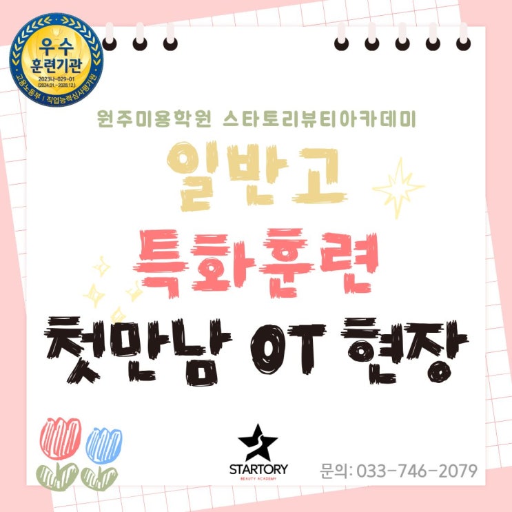 안녕하세요 원주미용학원 스타토리뷰티아카데미 입니다~ 새로운 시작은 언제나 설레면서도 조금은 어색한 순간이 함께하죠. 이번에 2026년 일반고 특화 훈련 과정이 개강을 했답니다. 이번 모집 과정에서도 많은 학생들의 관심 속에 모집이 잘 마무리되었고 새 학기를 맞아 새로운 훈련생 친구들이 한자리에 모이게 되었습니다. 오리엔테이션 및 자기소개 & 게임을 진행하며 일반고 훈련생 친구들이 서로 자연스럽게 친해질 수 있는 시간을 가져보았는데요~ 그날의 현장을 같이 보실까요? 1일차 - 두근두근 첫 만남! 오리엔테이션 기다리고 기다리던 2026년도 일반고 특화 훈련 개강 날! 첫날에는 과정 안내와 함께 학원 생활에 대한 전....... <img src="https://blogthumb.pstatic.net/MjAyNjAzMDlfNjcg/MDAxNzczMDM3MzM2MjQ4.z8ssv6wo3G82tnMNzZNexWkJOFFDjBK2fdNe7tJKFjIg.38VrsYtxhQCRdWpjenFx6_odOvfa2lAC66Dj3eUy06kg.JPEG/%C1%A6%B8%F1%C0%BB_%C0%D4%B7%C2%C7%D8%C1%D6%BC%BC%BF%E4._%2846%29.jpg?type=s3" />