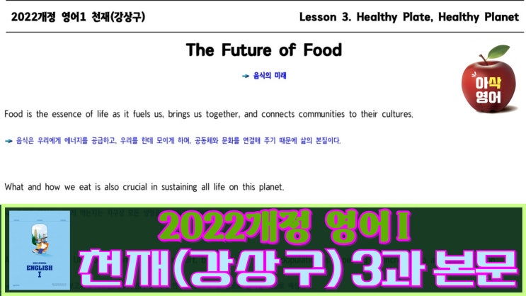 2022개정 고등영어 I 천재(강상구) 교과서 본문 3과 영어지문(수업용)-아삭영어 한줄해석 한줄해석TEST 한줄영작TEST 2022개정 영어 I 천재 강상구 3과 교과서 본문 해석 교과서 본문 해석 TEST 교과서 본문 영작 TEST 2026년 고등학교 2학년 영어내신대비는 아삭영어! 1등급을 찍을 수 있는 유일한 비결~ 오직 단 하나! 빠르고 정확하게 복습하는 것!!! 빠르고 정확하게 여러 번 복습할 수 있는 자료를 만들어 드릴게요~! 여러분은 복습만 하시면 됩니다^^ 유튜브 검색창 : 아삭영어 #아삭영어 #원주치악고2학년영어교과서 The Future of Food 음식의 미래 Food is the essence of life as it fuels us, brings us together, and connects commu....... <img src="https://blogthumb.pstatic.net/MjAyNjAzMDZfMTUx/MDAxNzcyNzMzNjg4MzE0.qd6tLf93KC1FvzxGwvfkGPgLoMKVb4iVitak0WKSDPog.Pq7y02PsNSDJxrvPnDTuC-hNmIC89RqqF5AT_4pFsk4g.JPEG/2022%B0%B3%C1%A4_%BF%B5%BE%EE1_%C3%B5%C0%E7%28%B0%AD%BB%F3%B1%B8%29_3%B0%FA_%BA%BB%B9%AE.jpg?type=s3" />