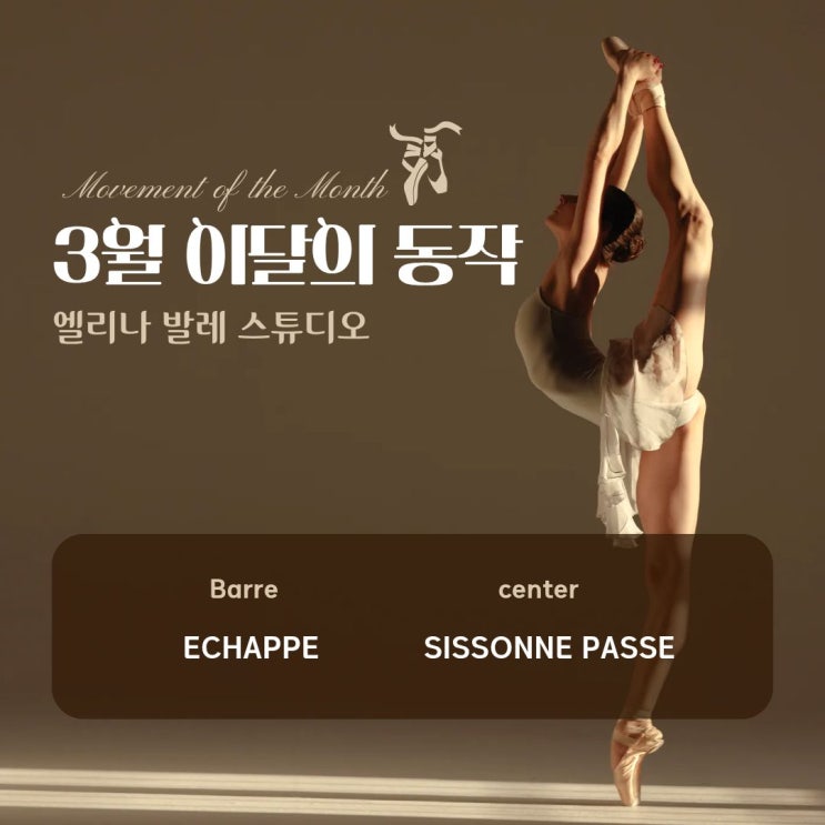 안녕하세요 강릉 엘리나 발레스튜디오 입니다. 지난 달에 소개해드렸던 ROND DE JAMBE (롱드잠브)와 PAS ASSEMBLE (파 아쌈블레) 동작은 잘 익혀보셨나요? 동작을 반복하며 연습하다 보면 점점 몸의 균형과 발레 기본기가 잡히는 것을 느낄 수 있을 거예요. 3월에도 여러분께 도움이 될 새로운 동작들을 준비했으니, 이번 달에도 즐겁게 발레를 배우며 차근차근 실력을 쌓아보아요! 이번달은 바에서 ECHAPPE (에샤뻬) 센터에서 SISSONNE PASSE (시손느 파쎄)를 집중적으로 배워 볼 예정입니다. 천천히 정확한 자세로 연습하며 유연성과 균형감각, 그리고 하체 근력까지 함께 키워보는 시간을 가져볼게요! ECHAPPE (에샤뻬) *주로 5번 포지션에서....... <img src="https://blogthumb.pstatic.net/MjAyNjAzMTFfMjYx/MDAxNzczMjA5MTEwMzM3.t1EAigMPnHGTZmsGNdh5d4ywr3zwD7RFwrdjBvvxyg4g.2YsPNZmsZJR5l_39MK-TQWzW61EhZMIwsv0pZkyYdD0g.JPEG/1.jpg?type=s3" />