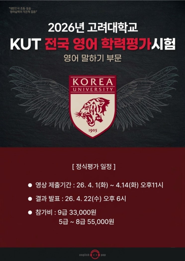 "단순히 영어를 읽고 쓰는 시대는 지났습니다. 이제는 자신의 생각을 얼마나 자신 있게, 정확하게 표현하느냐가 실력의 척도입니다. 우리 아이의 영어 실력, 객관적인 지표로 확인해 보신 적 있으신가요?" "2026년 고려대학교 KUT 전국 영어 학력평가시험이 개최됩니다. 이번 대회는 특히 '영어 말하기 부문' 으로 진행되어, 아이들이 무대 공포증을 극복하고 영어에 대한 성취감을 느낄 수 있는 최고의 기회입니다." 아이의 현재 수준에 맞춰 9급부터 5급까지 전략적으로 도전할 수 있습니다." 1. 기초(9~8급): 영어 책 읽기를 통해 읽기 실력과 발음 교정 2. 심화(7~6급): 원고 외우기를 통한 표현력 및 암....... <img src="https://blogthumb.pstatic.net/MjAyNjAzMTdfMTQg/MDAxNzczNzM2NzEyNzM1.jIpXOo0wB6--HCLuHZTAqxk8f5y6RORR2veodAceKtIg.7LtuQPY6kSHmHiLgGj8aRiTCwZvFDtYxUauV2SG4NW4g.JPEG/%C0%D7%C6%CB%B9%EA%B5%E5_%BB%E7%C1%F8_20260310_1.jpg?type=s3" />