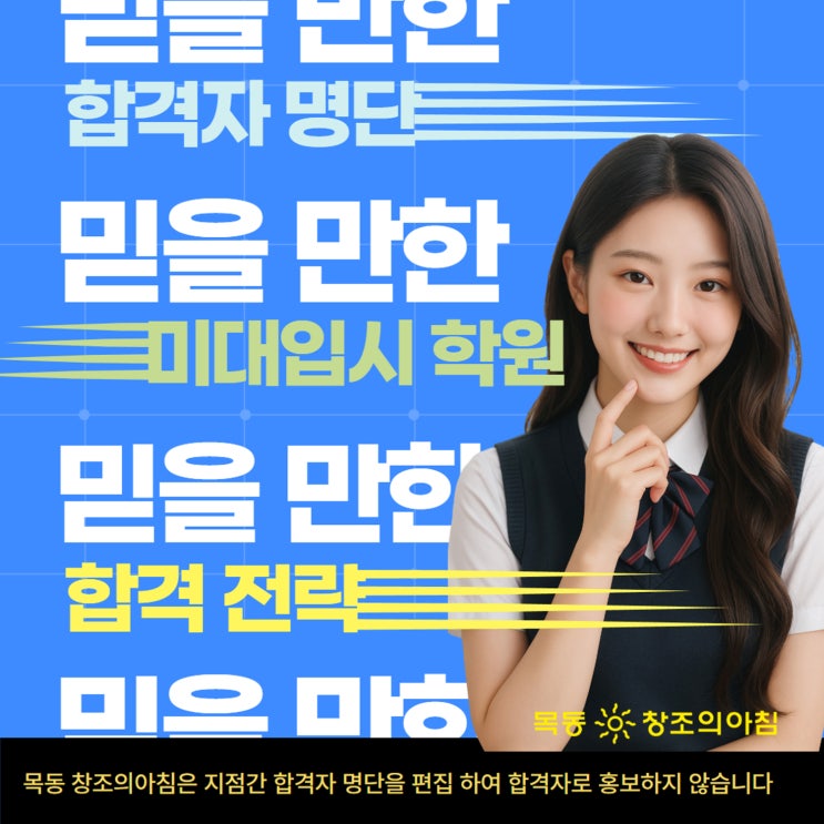 목동미술학원 목동창조의아침 입니다. 벌써 26년 3월 13일 이 되었네요. 아직은 쌀쌀하지만. 입시는 다시 시작 되고있습니다. 요즘 SNS에서 많이 논란이되는 합격자 명단을 조작이나 AI합격자 인터뷰에 그림까지 ^^ 순수해야 할 예체능의 기본을 무시하는 상업적 홍보가 너무 많아 졌습니다. 목동에서 합격한 서울S대에 합격한 학생이 자기과에 현역이 2명이고 나머지는 재수 삼수생이라는 이야기를 들어 보면서 미대입시가 얼마나 많은 문제점을 보여 주고있는지를 한번에 알수 있었습니다. 앞으로 8차 미대입시과정에서는 분명 많은 변화가 있을 것으로 보입니다. 어떤 학원에서 해야만 원하는 대학을 갈 수 있을까? 가끔 특정 지역에서 특정 학....... <img src="https://blogthumb.pstatic.net/MjAyNjAzMTNfNzAg/MDAxNzczNDAwMjE4Mzc4.C-ujqwf4pnrrc_D9RlQoBMpKZLAn7c7BmG0TQ6uj86Mg.giiB3kCHxwrhcBvNVkWb0IT4o97_aFbqyURBoNC-hosg.JPEG/%B9%CF%C0%BB%BC%F6_%C0%D6%B4%C2_%B9%CC%B4%EB_%C0%D4%BD%C3%C7%D0%BF%F8__%B8%F1%B5%BF%C3%A2%C1%B6%C0%C7_%BE%C6%C4%A7_%BE%C6%C4%A7.jpg?type=s3" />