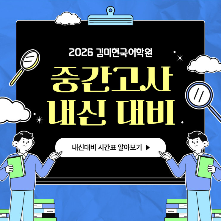 안녕하세요! 국어 성적의 확실한 기준, 김미현 국어학원입니다. 새 학기의 설렘도 잠시, 우리 학생들과 학부모님들의 시선은 벌써 '1학기 중간고사'를 향하고 있습니다. 첫 시험의 결과가 1년의 자신감을 결정하기에, 김미현 국어에서 완벽한 내신 대비 시간표를 준비했습니다! 1. 내신대비 개강 일정 시험 대비는 기선제압이 생명! 학년별 개강일을 꼭 확인해 주세요. ✅ 고등부 3월 11일(수)부터 순차 개강! ✅ 중등부 3월 25일(수)부터 순차 개강! 2. 학교별 내신대비 라인업 중간고사는 학교별 출제 경향이 매우 다릅니다. 김미현 국어는 [학교별 전담 수업]을 통해 가장 확실한 내신 대비를 보장합니다! [중2 내신대비....... <img src="https://blogthumb.pstatic.net/MjAyNjAzMTRfMjg1/MDAxNzczNDY1ODU3MDM0.FHwAPpmNedfbOWfcq5_JFI38D78h_CvfM1TwTb3MvNog.bynycv2i_OdY5PQSnwoiLokv3PJ7uK5JeUFSAppbIQ8g.PNG/2026_1%C7%D0%B1%E2_%C1%DF%B0%A3%B0%ED%BB%E7_%B3%BB%BD%C5%B4%EB%BA%F1.png?type=s3" />