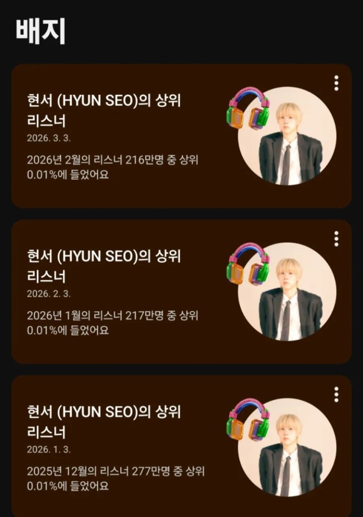 요즘 수업 준비를 하면서 듣는 노래는 현서의 곡들이다. 그래서인가 리스너 상위 0.01%에 들었다. ^^;; <img src="https://blogthumb.pstatic.net/MjAyNjAzMTlfMjgy/MDAxNzczODk0NTA1MTc2.2m79kwnKvNQtFsgDKnhd0CoV_8lTNfiDcV6HSMLL6dQg.Xh-qa6Rs2mxbjtFc_CVHpRqFlzIl1HBRMRwBqukSOtsg.JPEG/900%A3%DF1772595632669.jpg?type=s3" />