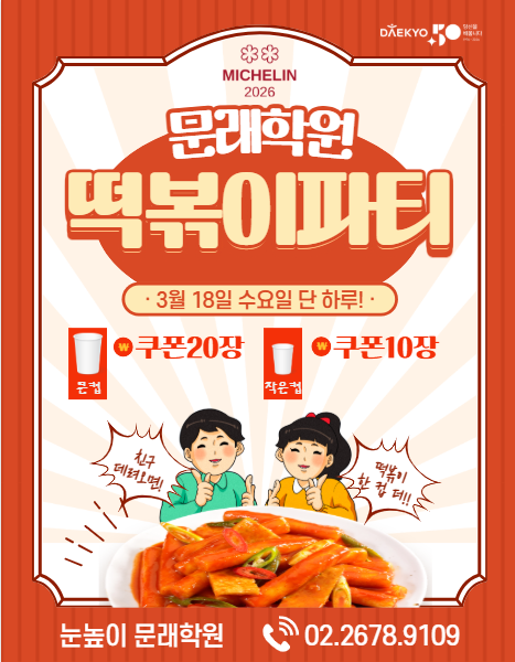 안녕하세요 아이들의 성장과 즐거운 배움을 함께 만드는 눈높이 러닝센터 문래학원입니다. 3월 18일, 아이들이 정말 기다리던 특별한 떡볶이 파티 이벤트가 진행되었어요 ️ 열심히 공부한 만큼 맛있는 보상! 이번 이벤트는 단순한 간식 파티가 아니었어요. 아이들이 평소 성실하게 학습하며 모은 칭찬쿠폰으로 직접 떡볶이를 교환하는 방식으로 진행되었습니다. ✔ 쿠폰 10개 → 작은컵 떡볶이 ✔ 쿠폰 20개 → 큰컵 떡볶이 스스로 노력하고 보상받는 경험을 통해 아이들의 자기주도학습 습관까지 자연스럽게 형성됩니다. 교실 가득 퍼진 즐거운 웃음 떡볶이를 받으러 오는 아이들의 얼굴에는 기대감과 뿌듯함이 가득했....... <img src="https://blogthumb.pstatic.net/MjAyNjAzMTlfOSAg/MDAxNzczOTAwOTIwMDE2.YJfQXfoIkRP5TzRvk2umi3MR8GYiLOmvDjbmTQ3bY2Ug.FFqywosDCSVpm6y4ZzDboImcHVpEaz3BnSzZclt6c-Qg.PNG/image.png?type=s3" />