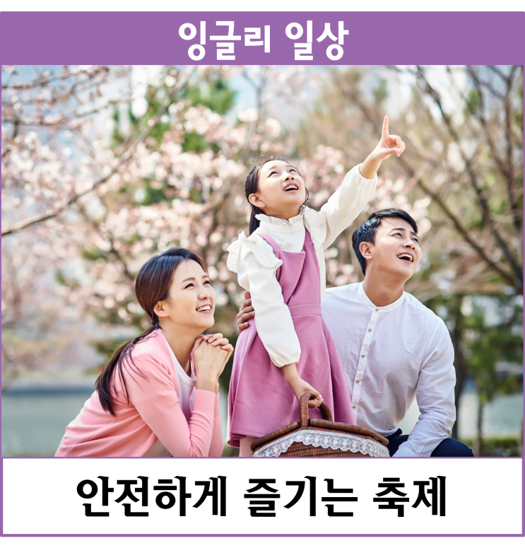 안녕하세요. 잉글리시아이입니다:) 점점 따뜻해지는 날씨로 봄이 오고 있다는 것을 실감하게 되는 요즘인데요. 따뜻해지는 날씨와 꽃들이 만개하는 봄에는 지역마다 다양한 축제가 진행됩니다. 오늘은 즐거운 축제를 안전하게 즐기기 위해 어떻게 해야 하는지 함께 알아보기로 해요!! 날씨 확인 및 편한 복장 축제가 활발하게 진행되는 봄·가을은 일교차가 큰 계절인데요. 출발 전 축제 지역의 날씨를 확인하고 기온이 내려갈 때를 대비해 겉옷 등을 챙깁니다. 또한 축제에는 많은 사람이 방문하고, 오랜 시간 걷게 될 수 있기 때문에 편한 복장과 신발을 신고 가방은 필요한 것만 간단하게 준비합니다. 안전요원의 지시 따르기 출입구 및 행사장....... <img src="https://blogthumb.pstatic.net/MjAyNjAzMTlfMjY1/MDAxNzczOTA0Mjc2OTM2._ypPUO-nobize6hQGEcuToYh75rfNWB8PWvFwkktgxEg.xfgVqokm9y5ELSPHnvuA-HJT069YoMRZkoyYWuCsPSUg.PNG/%B1%D7%B8%B21.png?type=s3" />