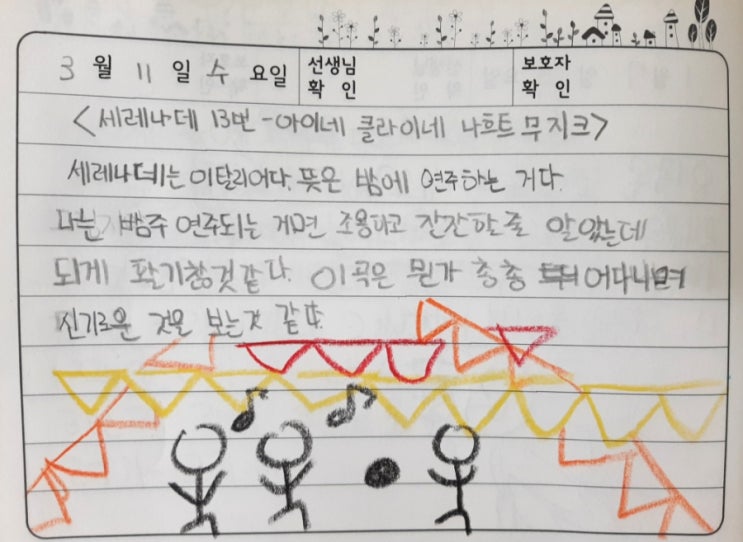 안녕하세요^^ 강동구 묘곡초 앞에 위치한 라라음악학원입니다. 라라에서는 아이들이 다양한 음악을 접하면서 그에 대한 자신의 느낌을 발견하고 표현력을 기를 수 있도록 음악 감상 수업을 진행하고 있어요. <지난 감상 수업> 오늘은 모차르트의 세레나데 중 <아이네 클라이네 나흐트무지크(작은 밤의 음악)>라는 예쁜 별명의 곡을 감상했어요. 본래 ‘밤에 부르는 노래’라는 뜻의 세레나데지만, 슈베르트의 애틋한 고백과는 다르게 모차르트 시대의 세레나데는 밤에 귀족들이 여는 파티의 화려한 배경음악이었답니다. 사실 이 곡은 모차르트가 세상을 떠난 뒤 낡은 악보 더미 속에서 우연히 발견된 곡이에요. 모차르트가 자신의 작....... <img src="https://blogthumb.pstatic.net/MjAyNjAzMTFfMjIy/MDAxNzczMjIzNTkyNzM3.XhFvovRl7MGTdjMkLrh7CowfP1h7j8v65eKtn99yFAog.syVXsZnZi2uZBfhOXpcZlJT3YGhQu9cju3fOl1nIPB8g.JPEG/900%A3%DF1773223578780.jpg?type=s3" />