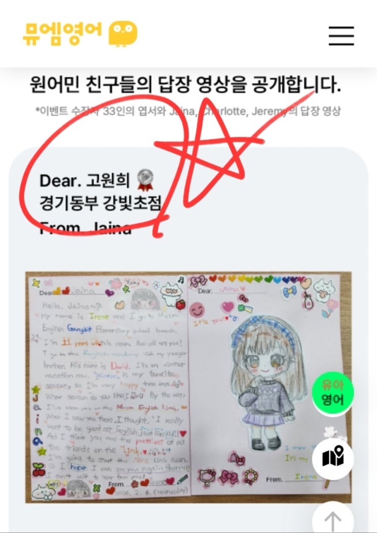 20260313뮤엠영어 편지쓰기에서 2등을 했어요^^