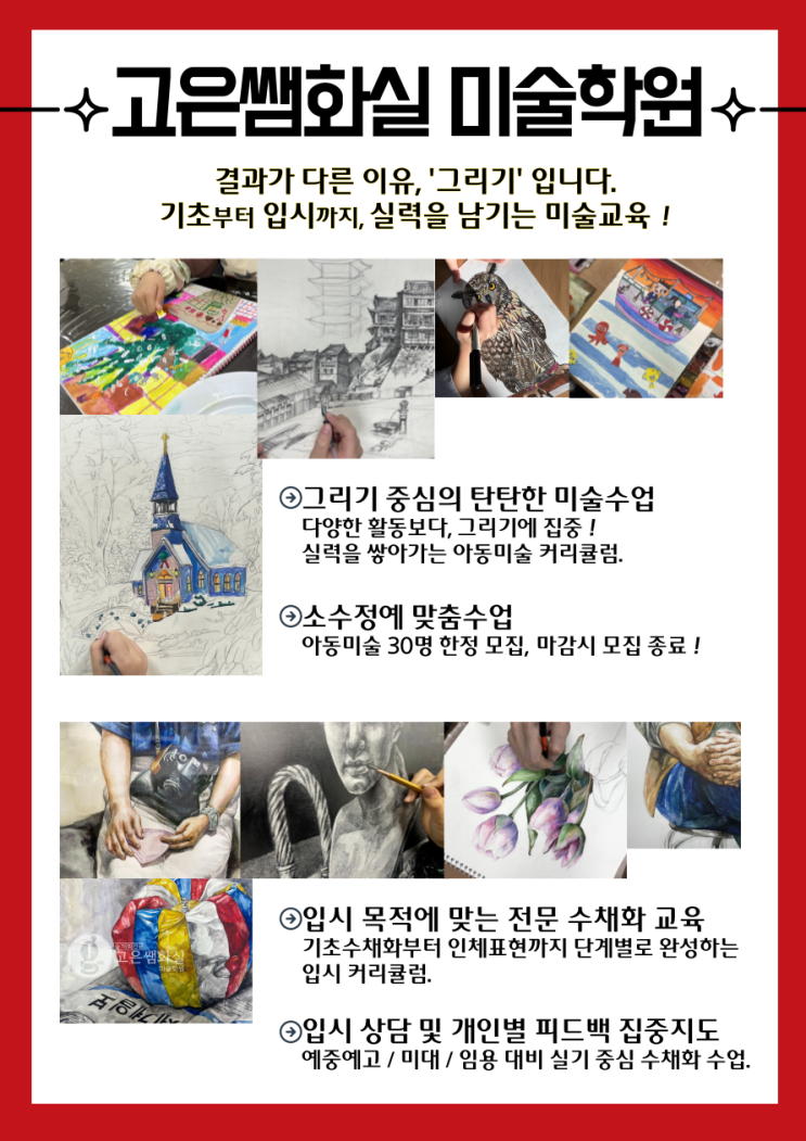 안녕하세요 고은쌤화실입니다 !! 요즘 아이들의 흥미와 재미를 위해 다양한 방향으로 미술의 폭을 넓혀서 요리. 만들기. 과학. 테블릿 까지 정말 많은 미술의 주제가 생기고 있어요 우리 친구들은 정말 다양하고 폭넓은 미술을 경험하고 만날수 있는 때에 교육을 받을수 있는것이 축복이네요 ! 미술을 배움에 있어서 시대에 흐름에 따라 여러가지 다양한 모습으로 미술을 만나는 것도 중요하지만 고은쌤화실은 미술의 본질을지켜 그리기 위주의 수업을 이어가고 있어요 그렇다고 ~~ 그리기 위주라고 해서 지루하게. 그냥 그리기만 하는것은 아니죠 ! 그리기를 주로 하는 만들기 활동과 재미도 있고 그리기 실력을 향상시킬수 있는 기초에 충실한....... <img src="https://blogthumb.pstatic.net/MjAyNjAzMThfMjI0/MDAxNzczODQzODEzMjM3.61l0sWxSCJvlj73B0pqeQogIUnOnQHYN-wJxGyTytPwg.XlgLdPKxbjBXuDgIa-52uSAJXerjZ9_ZEb6wtVCxH-4g.PNG/IMG%A3%DF8266.PNG?type=s3" />