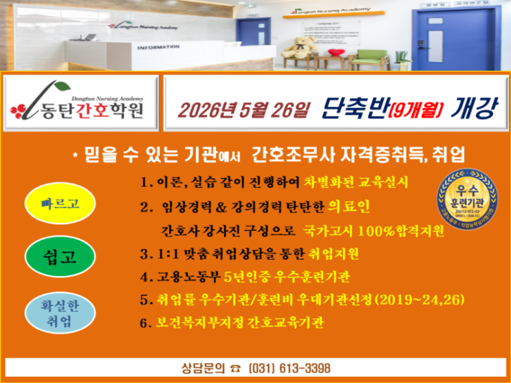 동탄간호학원, 5월 26일, 9개월 단축간호조무사과정, 선착순 등록중