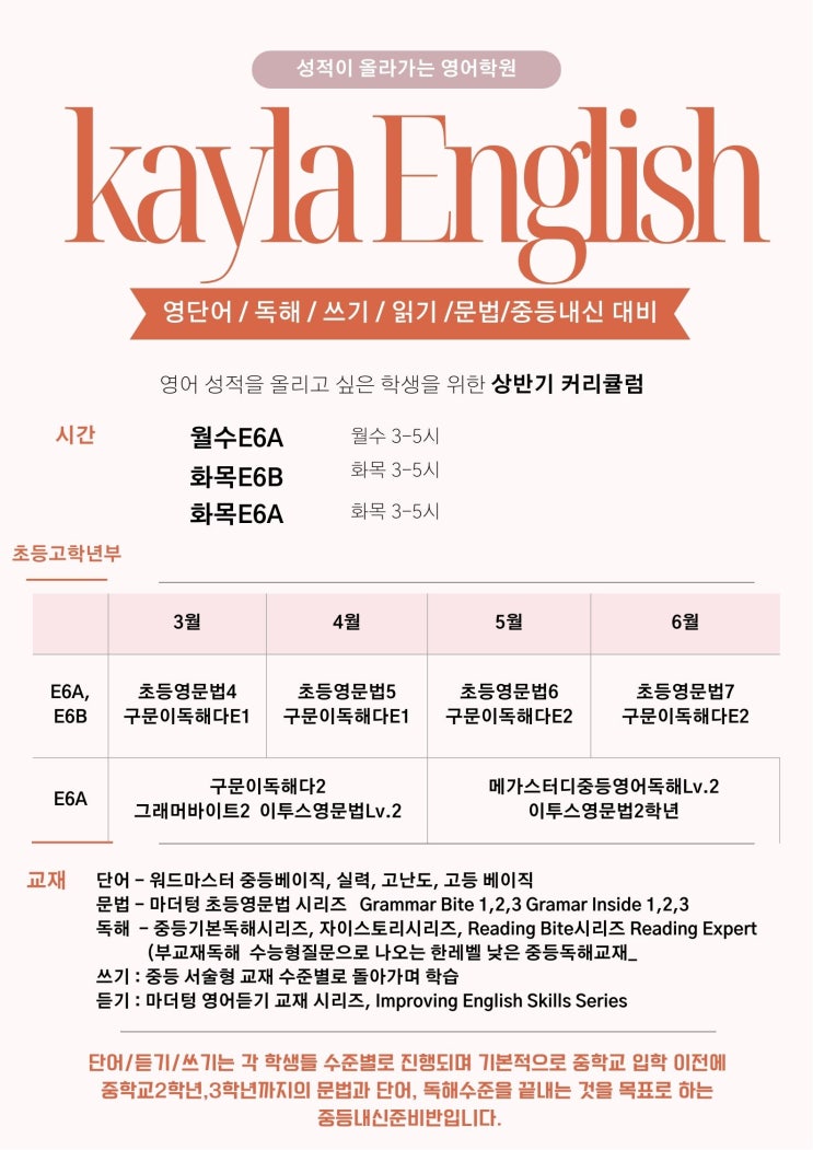 새학기가 시작되었습니다! 저에게 와준 우리 학생들이 이제 그래도 1년 넘어가고 있으니 어느정도 학습량도 자리잡고 목표의식도 생기고 있는 것 같습니다. 올 여름방학전까지의 학년별 커리큘럼 안내드릴게요 초등고학년부 5학년때부터 저랑 한 친구들은 지금 중2 교재들을 쓰고 있구요, 내년 중학교 입학전에는 중등2학년과 중학 수준의 독해는 거의완성될것 같습니다. 중학교 1학년 아무래도 저랑 1년 이상 한 친구들은 지금은 수준이 꽤 올라간 상태라서 반마다 교재가 조금씩 다를 수 있습니다. 중학교 2학년 2학년부터는 1학기에 중간 기말을 보기 때문에 실질적으로 영어 실력을 쌓으 시간은 많이 없습니다. 그래서 방학을 잘 활용해야 합....... <img src="https://blogthumb.pstatic.net/MjAyNjAzMTZfMjA0/MDAxNzczNjM1MTg5NTU1.cts9QjgDqmUzvUqWUOwNABDfQ6_WbkZYtlAcl89fih8g.22bfZZ2mk2yJAgACcHNQg09j8WcPc4UIHOsTE2FGehgg.JPEG/%C3%CA%B5%EE%B9%DD_1%C7%D0%B1%E2_%C4%BF%B8%AE%C5%A7%B7%B3.jpg?type=s3" />