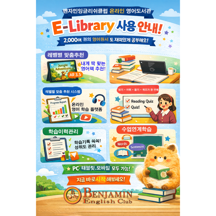 벤자민 온라인 도서관 E-library, 벤자민 오프라인 도서관과 같이 열심히 이용해 주세요!