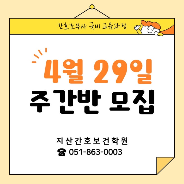 안녕하세요! 지산간호보건학원입니다 올해 간호조무사 자격증 취득을 목표시라면 이번 소식 주목 해주세요! 교육과정 상세 일정표입니다! 국민내일배움카드 사용가능 근로자도 실업자도 OK 실업급여 받고 있어도 OK 국민취업지원제도에 참여하고 있어도 OK 4월 29일 주간반 수강신청 사이트 바로가기 국비 신청 및 수강신청 하기가 어려우신 분들은 학원 방문하시면 등록까지 모두 도와드립니다! 지산간호보건학원은 ✔️우수한 강사진 ✔️높은 합격률, 취업률 ✔️쾌적한 환경 ✔️체계화 된 커리큘럼 ✔️협약 실습병원과 취업처 다수 ✔️간호조무사 자격증 포함 최대 4개의 자격증 수료증 취득 가능 (병원코디네이터1급, 노인심리상담사....... <img src="https://blogthumb.pstatic.net/MjAyNjAzMTZfMTE5/MDAxNzczNjQ0Mzk1MTY2.ItQspqBsilLqlivzopYYe7gOy28FLTFqpkI24t3vWoog.ikWyahAix08113kE4zjde9LEubxhR-vDToUhtz01fVAg.JPEG/4%BF%F9.jpg?type=s3" />