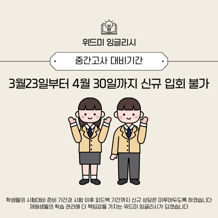 안녕하세요 부산 양정에 위치한 위드미 잉글리시 입니다 오늘은 26년 첫 시험대비 기간 동안 상담 여부 안내 포스팅 입니다 위드미 잉글리시는 매년 시험 기간에는 신규 등록을 받지 않고 재원생들의 시험 대비에 집중하고 있습니다 올해도 그 철칙은 변동이 없습니다^^ 게다가 1월부터 신규 상담과 등록이 이어져 이번 시험 기간엔 더 여유를 가지고 안정적인 시험 기간을 유지하려고 합니다 위드미 잉글리시는 중1 학생들도 똑같은 시험 대비를 진행하고 있습니다. 현재 위드미 잉글리시는 중등부 동의중 양동여중 망미중 거제여중 국제중 고등부 진여고 성모여고 양정고 동인고 부산외고 수업중이며 모든 클래스 6인 이하 소수정예로 운영됩니....... <img src="https://blogthumb.pstatic.net/MjAyNjAzMTRfMjk1/MDAxNzczNDcwMjE5Nzgw.1YzizLrxmO8ozLd23hGWI2KIcYfcctFEkcBP_5rBx88g.goqBe0jsRrLjTf9QQHHM_5iQWlOo85cHN9Bny53monIg.PNG/%BA%A3%C0%CC%C1%F6_%BD%C9%C7%C3%C7%D1_%C0%CF%B7%AF%BD%BA%C6%AE%B7%B9%C0%CC%BC%C7_%BD%C3%C7%E8%B1%E2%B0%A3_%BC%F6%BE%F7%BE%C8%B3%BB_%C0%CE%BD%BA%C5%B8%B1%D7%B7%A5_%C6%F7%BD%BA%C6%AE_%281%29.png?type=s3" />
