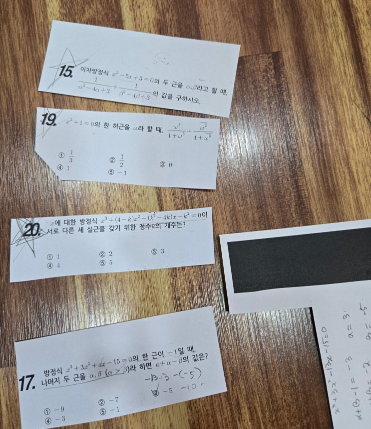 안녕하세요 수학전문학원 원장입니다 ^^ 중~고등학교로 갈수록 문제 유형은 많아지고 학생들마다 취약한 문제 유형 및 중요 문제들을 저희 학원에서 관리하는 방법을 소개할까 글을 작성합니다 ^^ 개인마다 어려워하거나 반복하여 틀리는 문제들을 모아 모아 복사를 해서 오려냅니다 (시험 쳤던 문제들이라 ^^;;) 학생들에게 선생님이 한 땀 한 땀 정성 들어 자신들이 직접 틀렸던 문제를 복사하여 오려서 문제들을 모아서 붙이고 마지막으로 복사를 합니다 ^^ 틀렸던 문제와 이해하기 힘들었던 문제들만 다시 풀어보는 걸로 끝나는 게 아니고 기존 문제와 숫자만 바뀐 쌍둥이문제 + 유사 문제 유형을 2~3 문제를 추가적으로 만들어서 다시 한번....... <img src="https://blogthumb.pstatic.net/MjAyNjAzMTZfMTc3/MDAxNzczNjQ3ODQ3ODM0.GorkQVA_fR8wCYopQGIOZchxqvGP49zGgjLMyd9ZFcQg.W2Wr4TCc0GiftWgDTnRCNIbliWrAbB1pD94PxonrUEQg.JPEG/KakaoTalk_20260316_124942870.jpg?type=s3" />