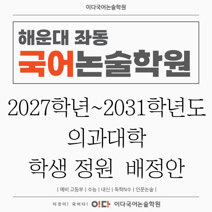 안녕하세요 부산 고등국어학원 이다국어논술학원입니다 내년 의대 정원은 현재 3,058명보다 490명 늘어난 3,548명으로 확정되었는데요 교육부에서 2027~2031학년도 의대 정원 배정안을 전국 40개 의대에 통지했다고 밝혔습니다 이다국어논술학원에서도 증원 및 정원 조정에 대한 포스팅을 며칠전에 올려드린 바 있는데요 부산, 울산, 경남은 예상했던 대로 97명의 인원이 배정되었습니다 지역/권역별로 놓고 봤을 때 절대적인 증원 규모는 부울경이 가장 크다고 할 수 있겠구요 학교별로는 강원대와 충북대가 39명으로 가장 많은 인원을 배정받았습니다 부산대 의대도 31명으로 그 뒤를 이어 많은 인원이 배정되었구요 경상국립대 22명, 고신대 7....... <img src="https://blogthumb.pstatic.net/MjAyNjAzMTZfOTQg/MDAxNzczNjMyNjIxMTcz.4VjMfFsZ5gGnzQN-LCfbBF828p72Qurn6c6FVZ7-nQ4g.bqC-VMZA8zMosT2FmsVPdEi1NjNyEX1cPfykW867er0g.JPEG/%C0%CC%B4%D9%B1%B9%BE%EE-%B3%D7%C0%CC%B9%F6-%BA%ED%B7%CE%B1%D7-%C1%A4%BB%E7%B0%A2%C7%FC-029_%283%29.jpg?type=s3" />